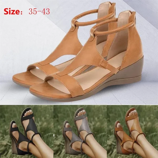 Women Summer New Simple Casual Greek Style Mid Wedge Heel Ankle Zipper Sandals