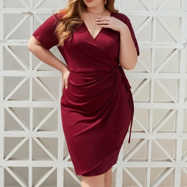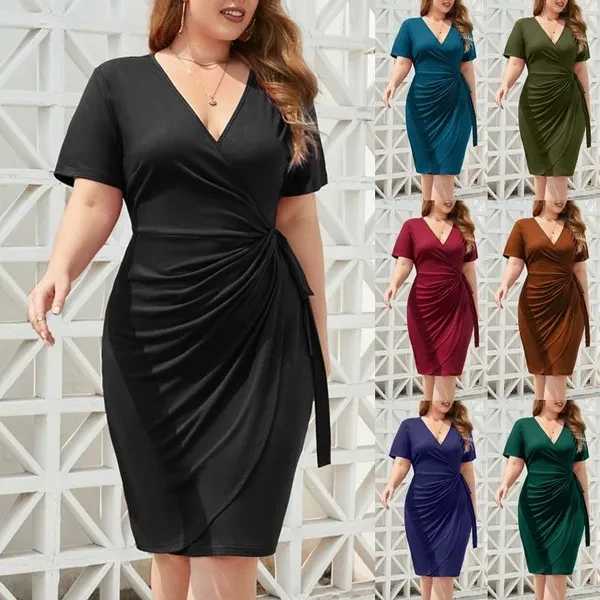Women's Fashion Casual V-neck Short Sleeve Dress Summer Slim Fit Pleated Dress Plus Size