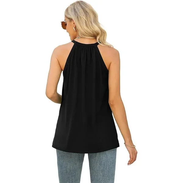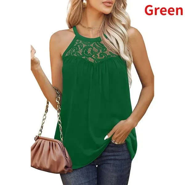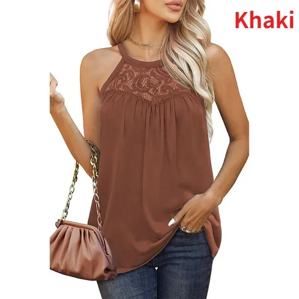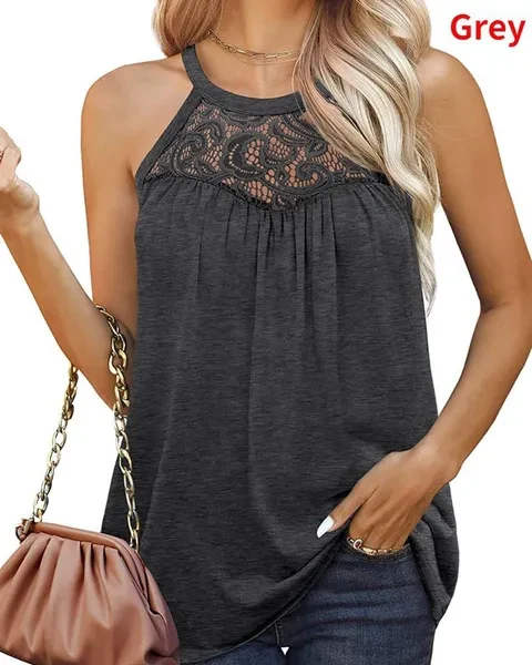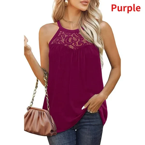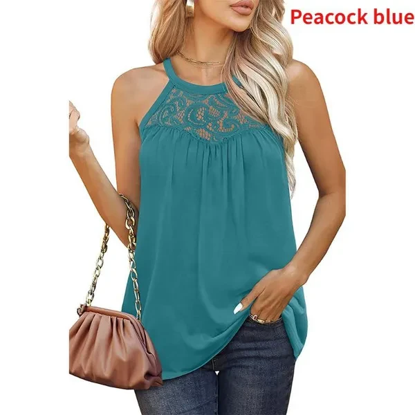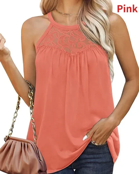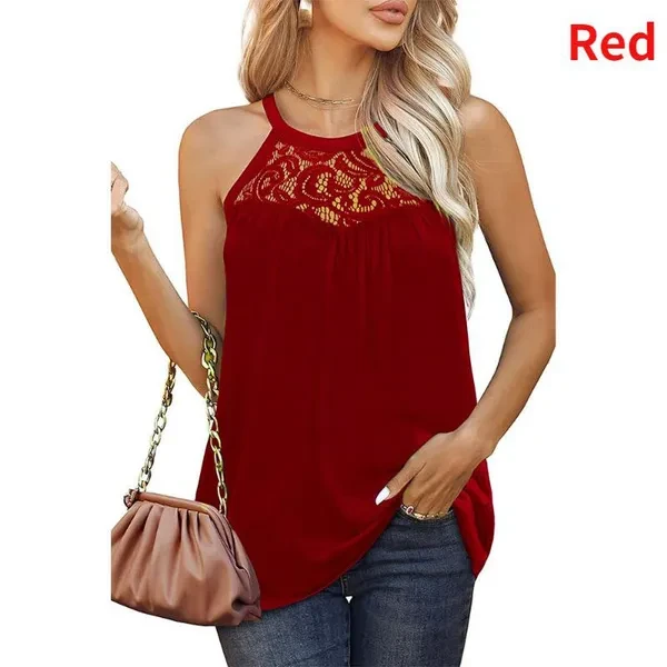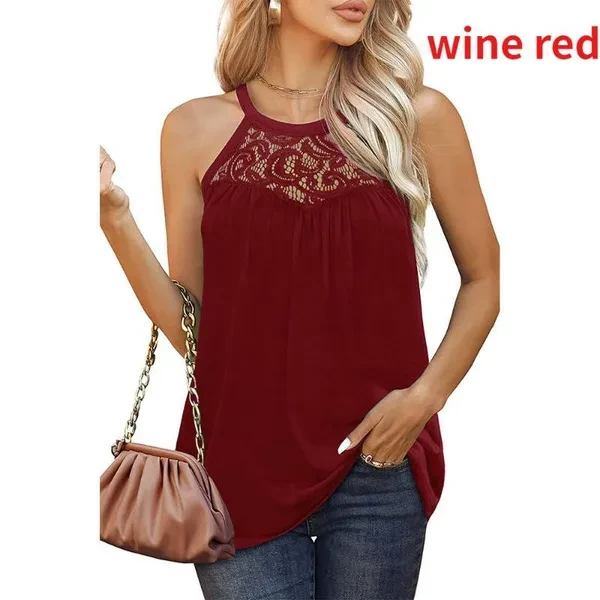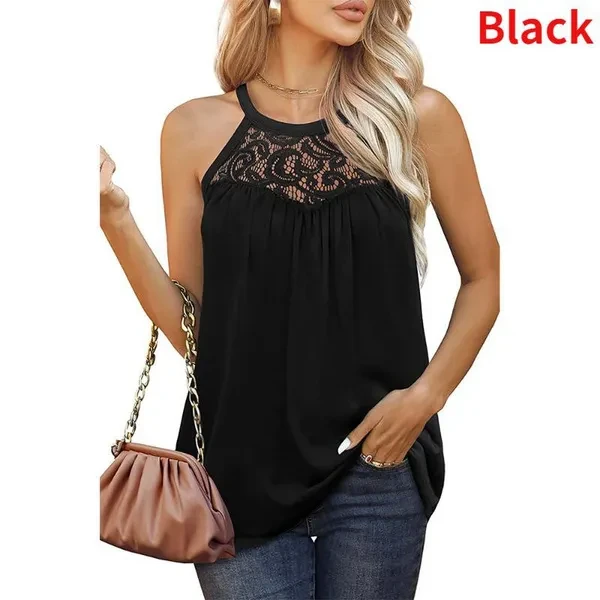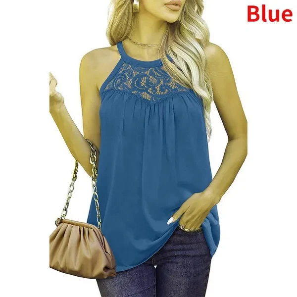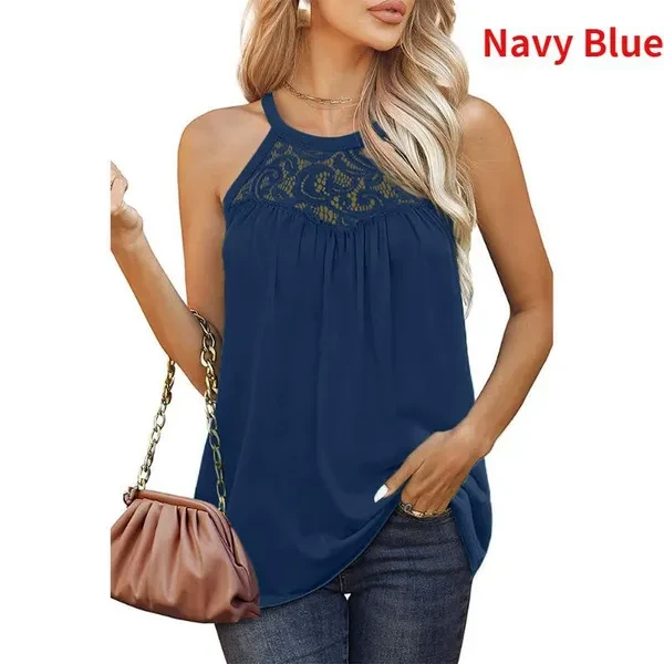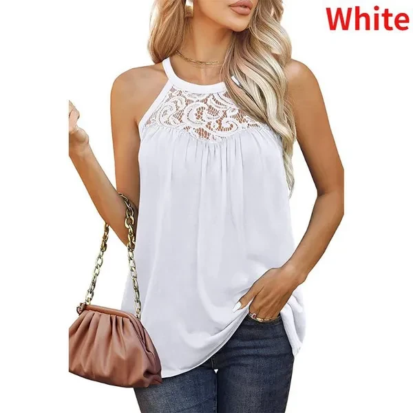 XS-8XL Womens Fashion Summer O-Neck Lace Sleeveless Tops Shirts Ladies Off Shoulder Pleated Spaghetti Strap Tops Loose Solid Color Summer Plus Size Halter Tank Tops T Shirts Blouse