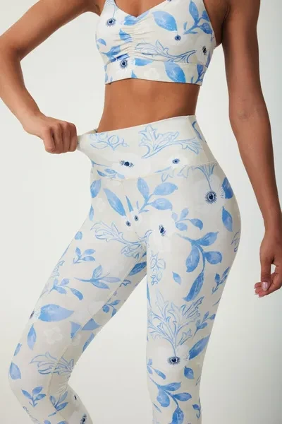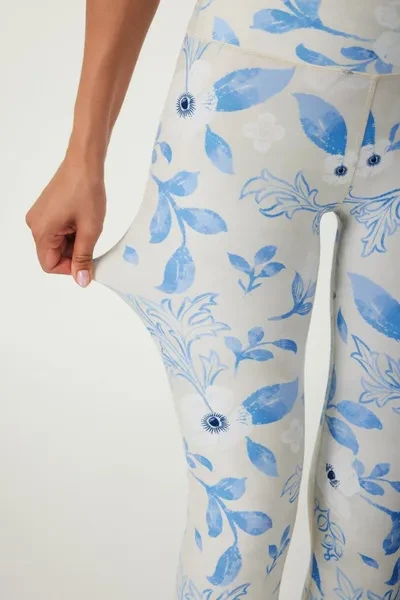 Pattern Description: Inspired by Bandari's "Dream Garden", Our designer captured the purest essence of its melodic tones and turned it into delicate blue flowers with fluid curves and lines with an elegant apricot backdrop, creating a clean and pristine aesthetic. The overall colour palette exudes an elevated sense of refinement. Infused with a touch of feminine elegance and purity, our pattern reflects the noble qualities of women! Product Features: High-waisted design perfectly shapes, supports and flatters any body types No small elastic band at the top No side seams for extra flattering fit and comfort Pair it with our matching Bandari Weave Back Sports Bra for a totally unique and dreamy look Fabric: Made with 84% RPET and 16% spandex from recycled plastic bottles and it is 100% recyclable! - Four-way stretch, breathable and anti-bacterial. Model Info: Melania // Height: 5'9  // Bust 33.1” //  Waist 23.6” // Hips 39.0” // SILVERWIND size S in tops & bottoms